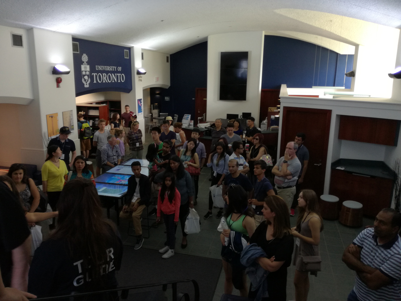 名札に付いているシールの色ごとにグループが分けられていて、1グループ10~12人程度。トロント大学の現役大学生に案内してもらいます。