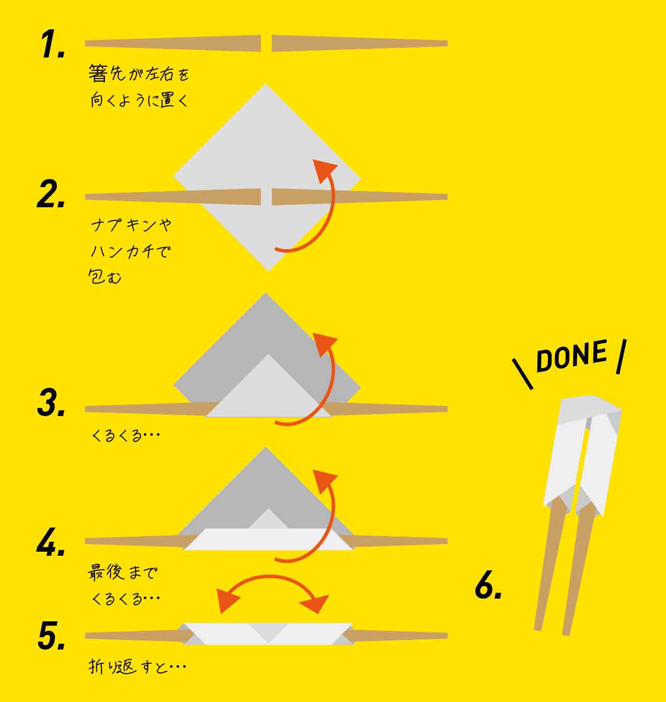 多民族都市のカナダ。家族や友達と出かけた時に、一緒にいる人が箸を上手く使えずに困っているような場面に出くわしたことがある人もいるだろう。そんな時に使えるテクニックを紹介。箸先が左右を向くように置き、箸の上部部分を向かい合わせにしてナプキンやハンカチなどで包む。そのままくるくると箸を包み、箸の上部部分で折り返すことで、トングのようになる。持ち方はまさにトングのような持ち方で、箸を上手く持てない人でも食事しやすくなる。