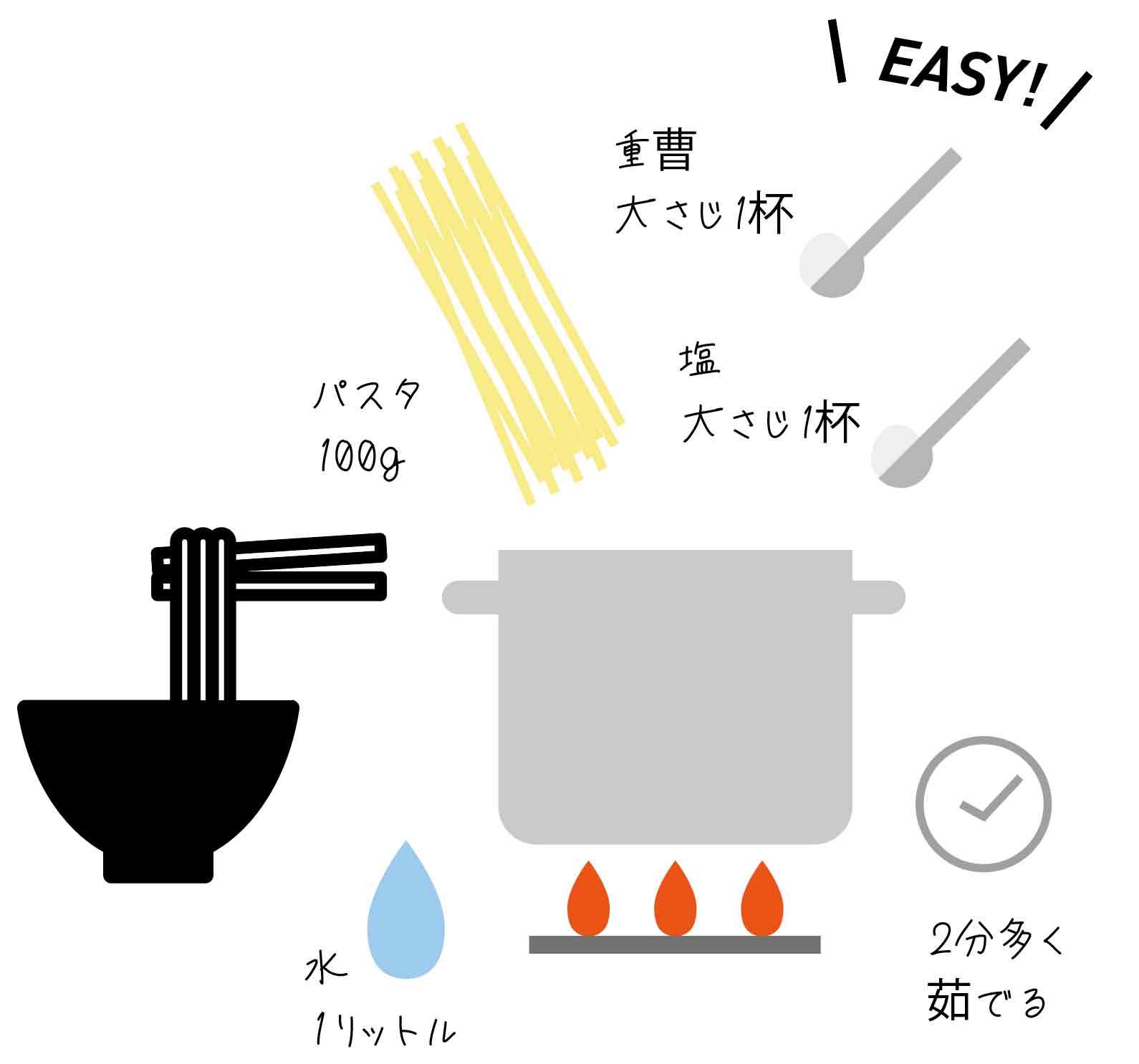 わざわざ中華系スーパーまでいくのはめんどくさい…という時に使えるこちらのライフハック。パスタ麺をゆでる時に重曹を混ぜると中華麺風になるというのだ。パスタ麺100gに対して水1リットル、塩大さじ1杯、重曹大さじ1杯を入れ、通常の茹で時間より2分多く茹でるだけ。ぬめりが気になる人は、流水でぬめりを取り冷やすと気にならないらしい。これでラーメンや焼きそばを作ってみよう。