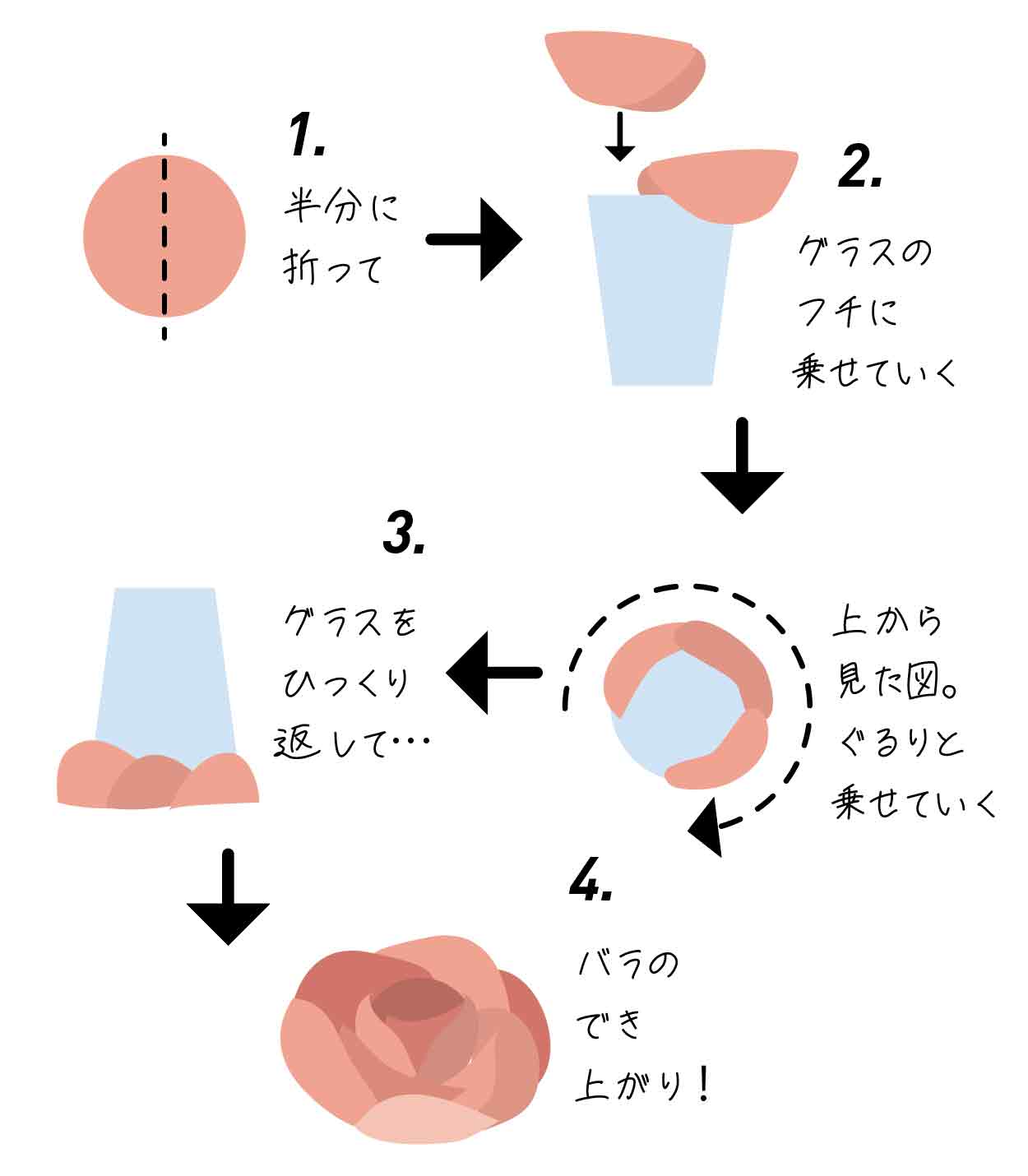 ハムを半分に折り、グラスに垂れる形で乗せ、それをグラスのふちを一周するまでぐるりと乗せる。グラスをひっくり返して皿に乗せることで、バラのような見た目になり一気におしゃれに。