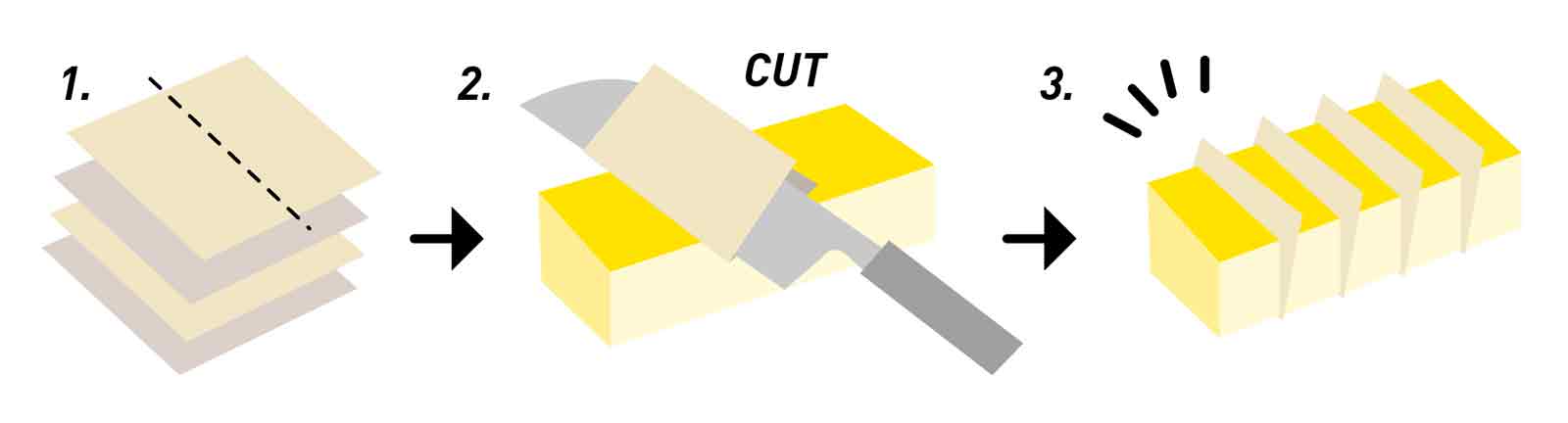 日本ではどこにでもある10グラムごとに切れているバター。それがあまり見つからないカナダ。バターを自分で切るための専用容器を買うこともできるが、今回は専用容器がなくても切れているバターを用意できる方法を紹介。バターの断面をカバーできる大きさに切ったクッキングシートを用意する。包丁にそのクッキングシートを挟みながらバターを切ることで、バター同士がくっつくことなく保管できるようになる。自分でバターを切る必要はあるが、バターが一切れずつシートで仕切られているためナイフなどを使わなくても取り出すことができるので便利だ。