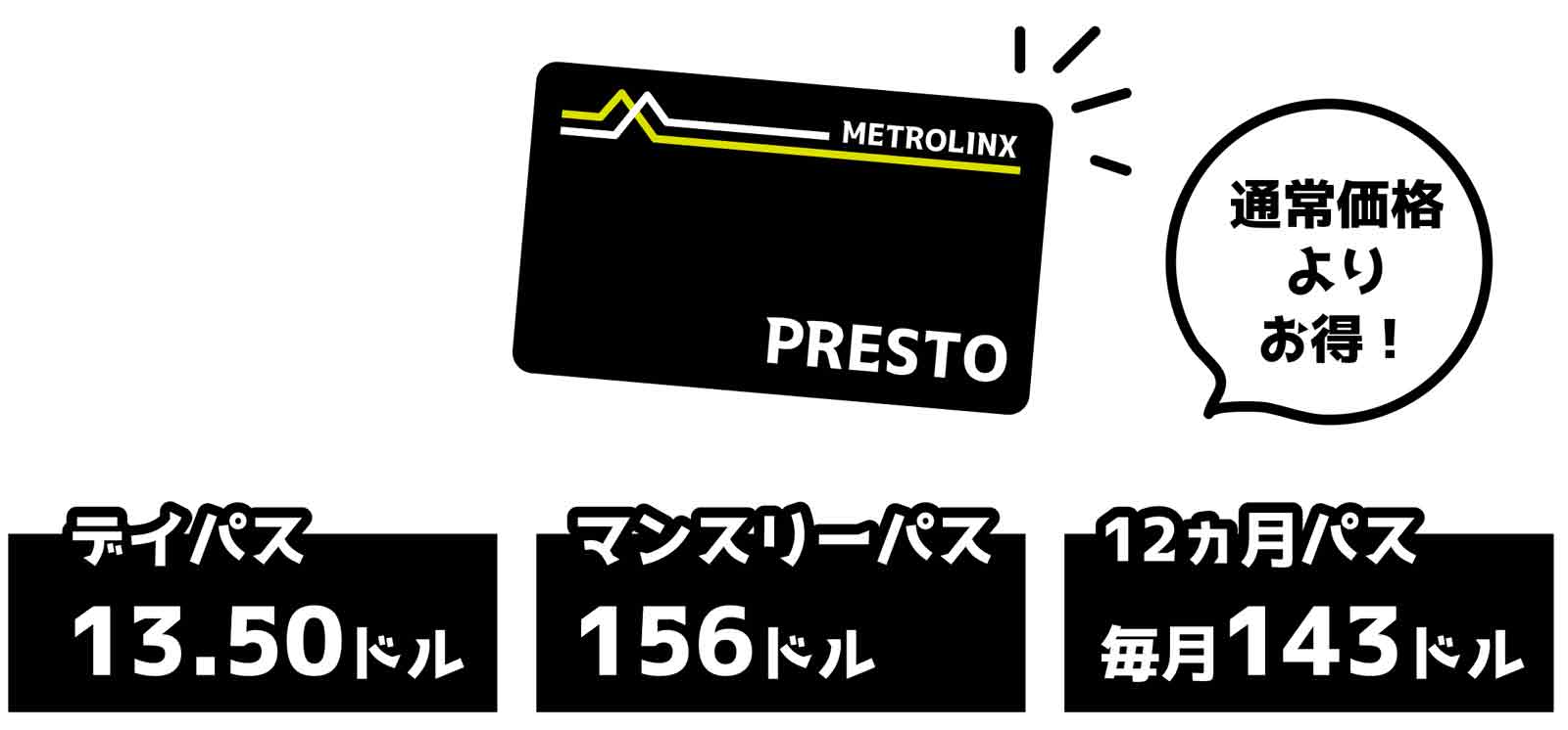 TTCなどの公共交通機関の利用の際に使うPRESTOやTTC Monthly Pass。デイパスチケットやマンスリーパスがある。デイパスチケットは13.50ドル、マンスリーパスは156ドルでマンスリーパスは、月初から月末までのパスとなっており、月末の12日前から、月初8日後まで購入できる。また、毎月利用する人には12カ月パスがおすすめ。こちらは毎月143ドルとなっており通常のマンスリーパスよりもお得で自動更新されるため楽チン。さらに学生割引を受けることもできる。小・中・高校生だけでなく一部のカレッジや大学なども含まれるため、前もって確認してお得に利用しよう。