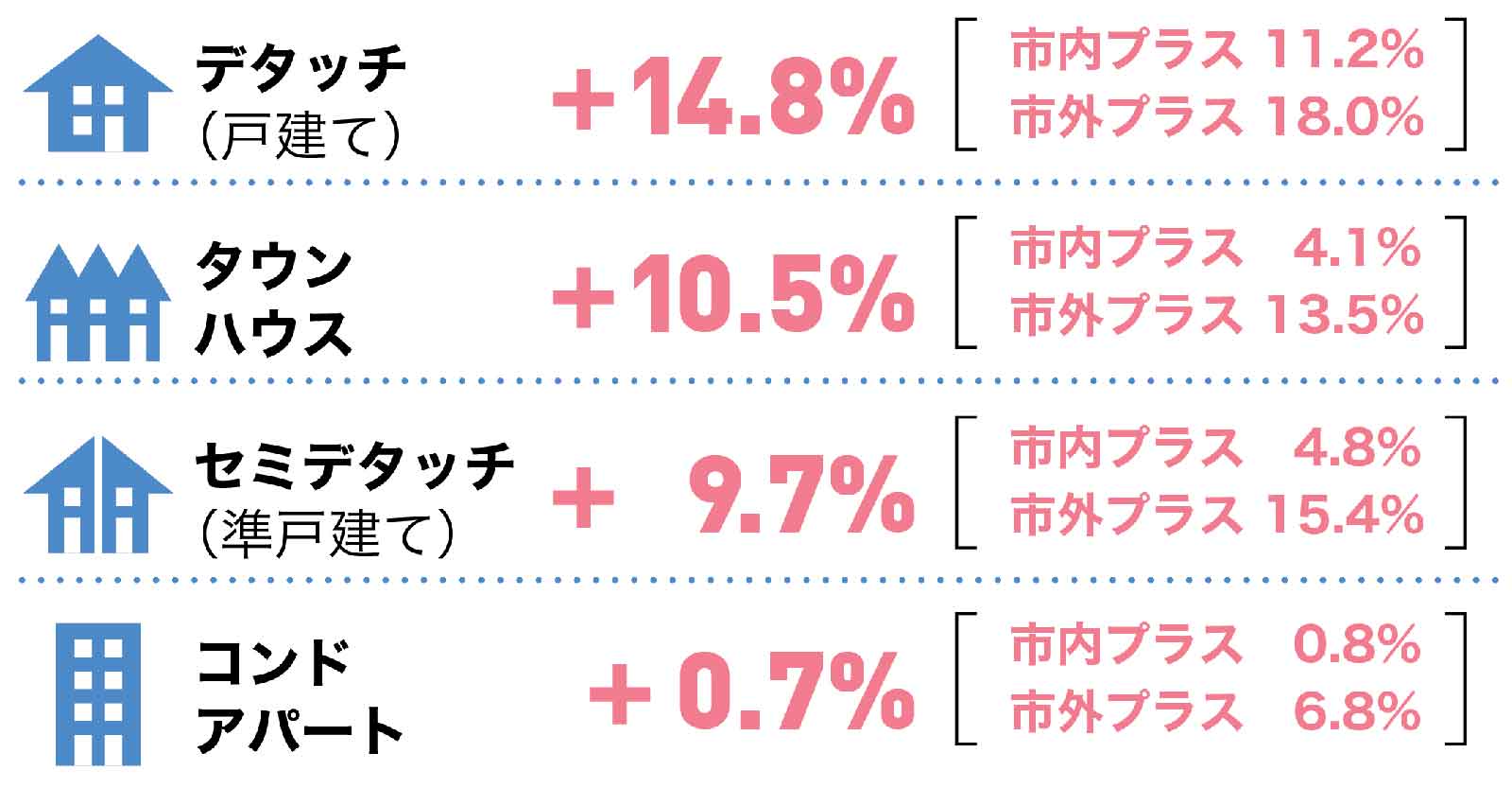 ダウンタウンのコンドアパートのマーケットが改善するにはコロナ問題を越える必要がありますが、それはまだ先が見えずあと数年はかかるかも知れません。翻って他の物件タイプのマーケットは堅調で、さらにトロントやバンクーバーなど大都市圏よりもオタワやモントリオールなど中規模都市圏の伸びが目立っています。それもコロナの影響でしょうか。今後のマーケットの動きに注視して行きましょう。