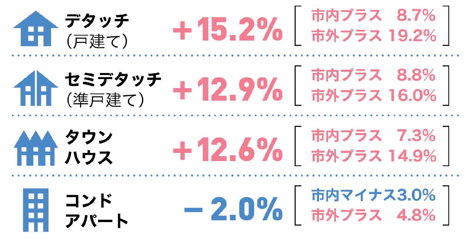 新規リスティング数はプラス33.5%、有効リスティング数はプラス15.4%と平均的に増加を見せていますが、物件タイプ・エリアにより大きく異なります。
