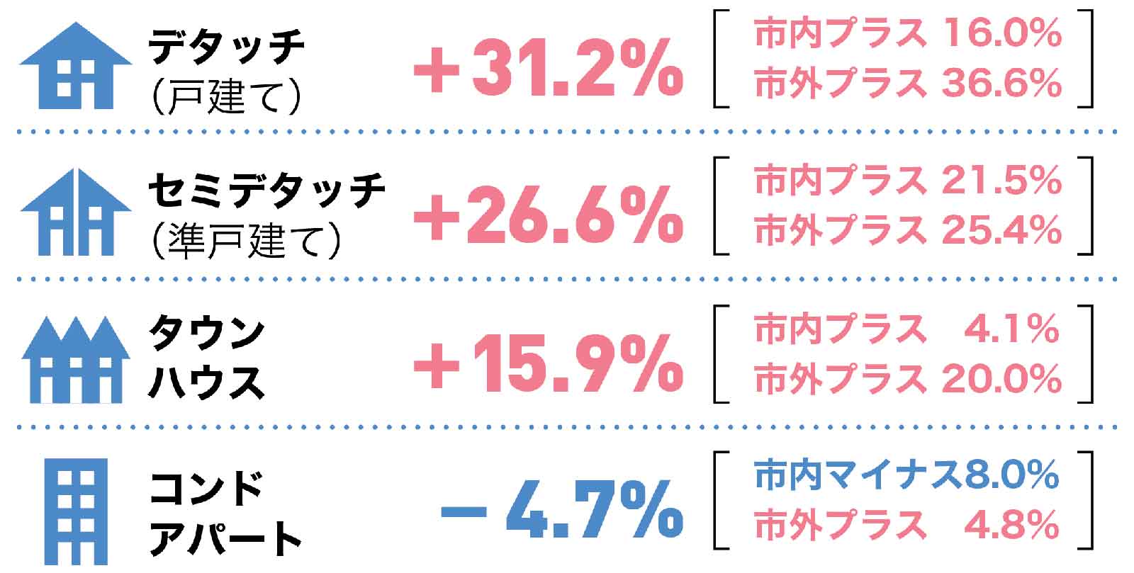 新規リスティング数はプラス20.2%、有効リスティング数はマイナス4.8%で売り出し物件の在庫補充が売却量とスピードに追い付いていないのが見て取れます。つまり買い需要が売り出し供給を大きく上回る売り手市場ということです。