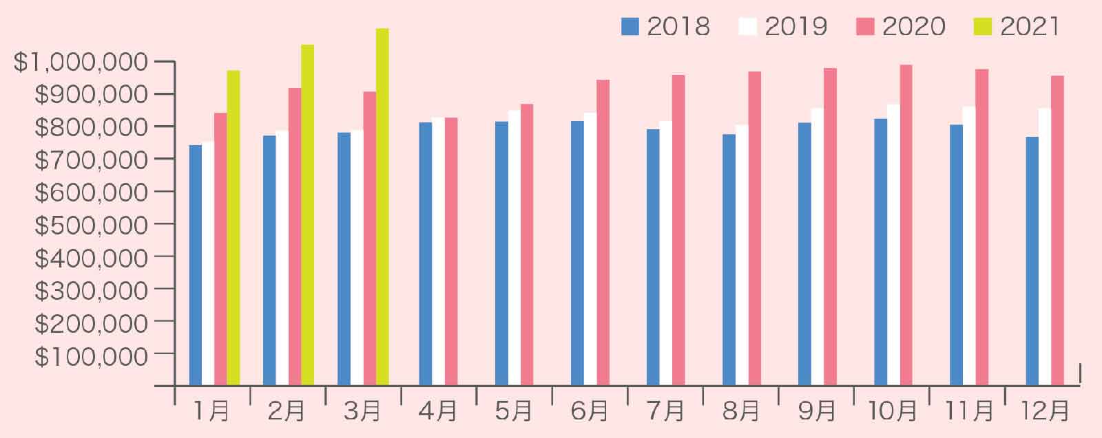 2021年3月のTREB全域・全物件タイプの総取引数は1万5652件となり、昨年3月の7945件からプラス97%と2倍近くにまで増加しました。