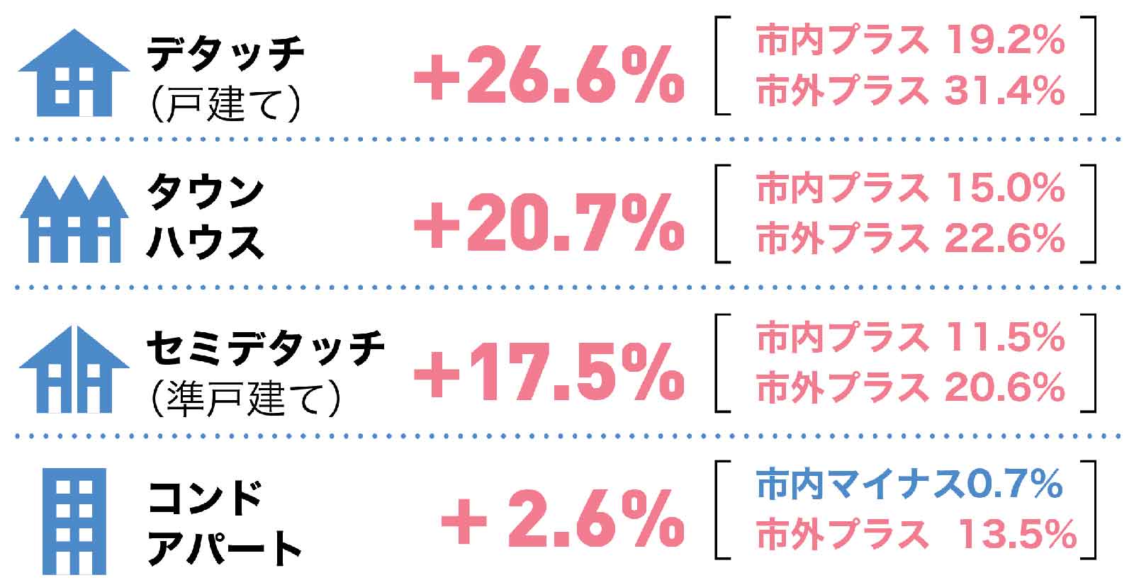 5ヶ月連続で市内のコンドアパートのみがマイナスとなっていますが、下げ幅は限定的となり市内コンドアパートの売れ行きは好調、再度プラスに転じてもおかしくはないように思われます。