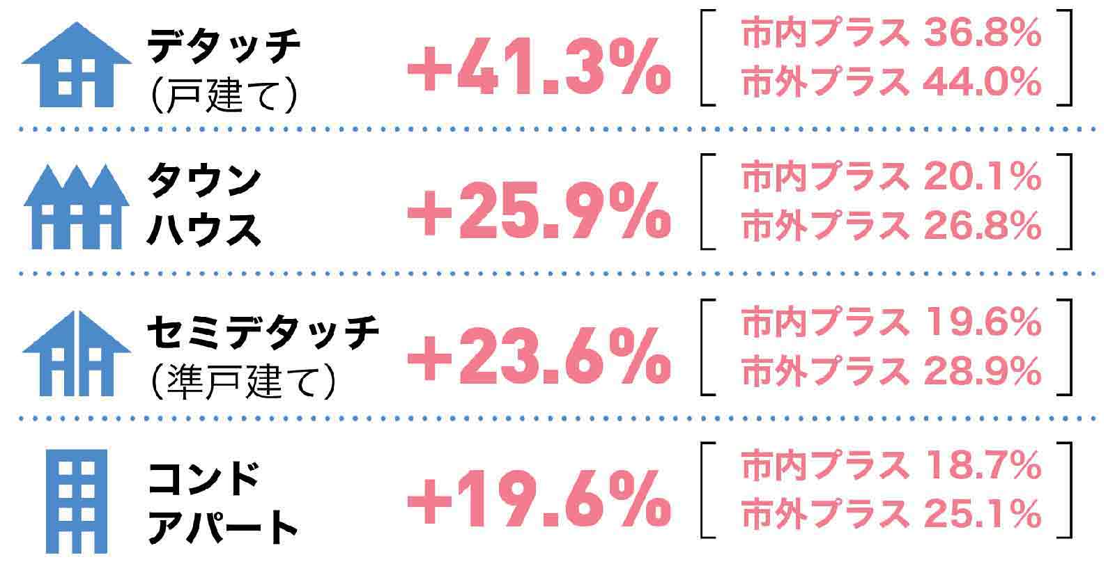 例えば先月の数字と比べてみますと、デタッチとタウンハウスの平均価格は市内・市外ともに微減しているのです。これはもちろん価格の大幅下落につながると言うことでは無いですが、価格急騰を避ける消費者がブレーキとなり、若干の頭打ちとして表れたと思われます。