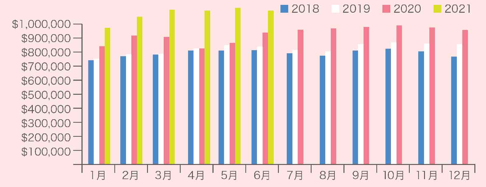 2021年6月のTREB全域・全物件タイプの総取引数は1万1,106件となり、昨年同月の8,645件からプラス28.5%上昇となりました。2月以降から少し落ち着いた感がありますが、しかし新規リスティング数はマイナス0.1%、有効リスティング数はマイナス19.3%となっており、需要と供給のバランスはまだ売り手市場に傾いたままです。
