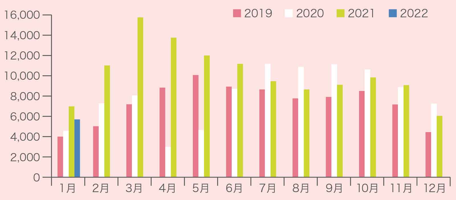 2022年1月のTREB全域・全物件タイプの総取引数は5,636件となり、2021年1月の6,888件からマイナス18.2%の減少となりました。新規リスティング数はマイナス15.5%、有効リスティング数はマイナス44.0%と相変わらずの物件不足です。当然の事ながらビディングウォーが激しく、価格高騰につながっています。