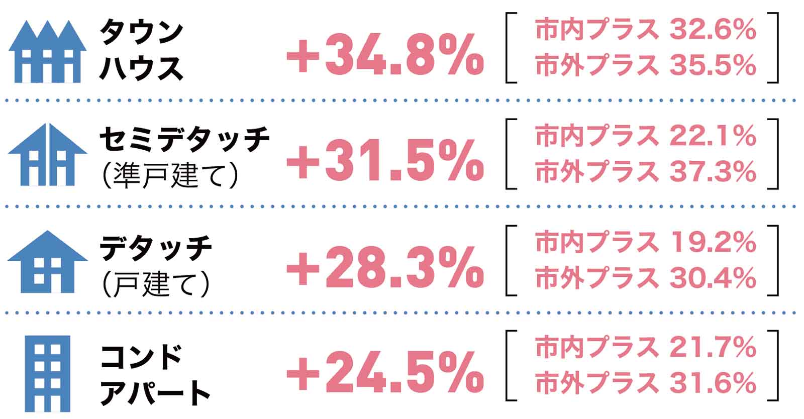 市外の上昇率が全物件タイプで30%を越しているのはそれだけ市外のマーケットが活発である裏付けでしょうか。市内も高いレベルの伸びを保っていますね。