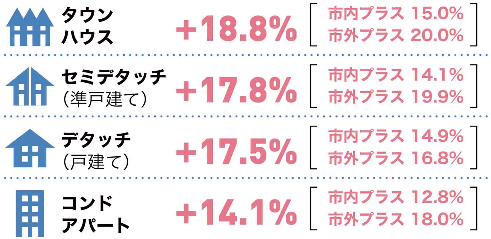 価格上昇率は確実に抑えられているのが見てとれますが、それでも全ての物件タイプにおいて平均二桁台の伸びを保っています。ただし、近々で価格の急上昇を経験したエリアなどはこのようなマーケット状態で真っ先に下方修正を受ける場合が多く、平均だけではなく各マイクロマーケットの状態は個別に判断する必要があります。