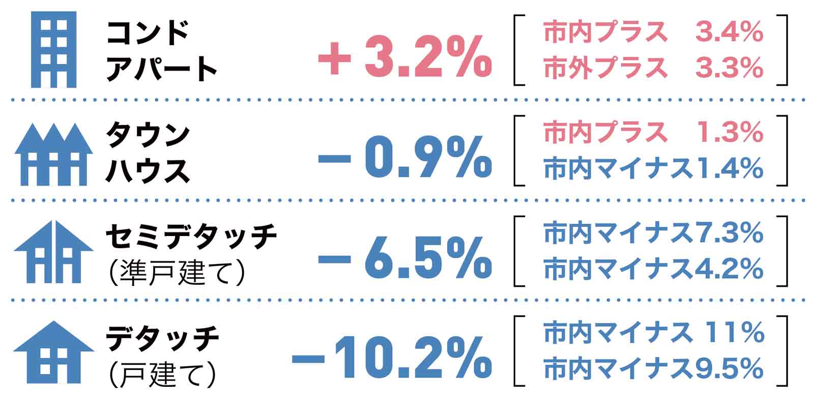 過去のデータから見ても、何らかの要因でマーケットに調整が入った場合、往々にして高価格帯の物件タイプ(戸建て)が大きく影響を受け、比較的安価な物件タイプ(コンドアパート)は下がりにくいことが観察されています。その意味では予想の範囲内と言えるでしょう。