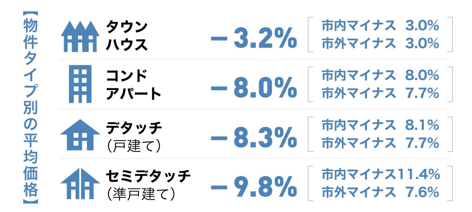 各物件タイプの下げ幅は市内のセミデタッチを除いて全て一桁台に収まり、市外の価格減少傾向も落ち着いたように見え、広いマーケットで回復しています。
