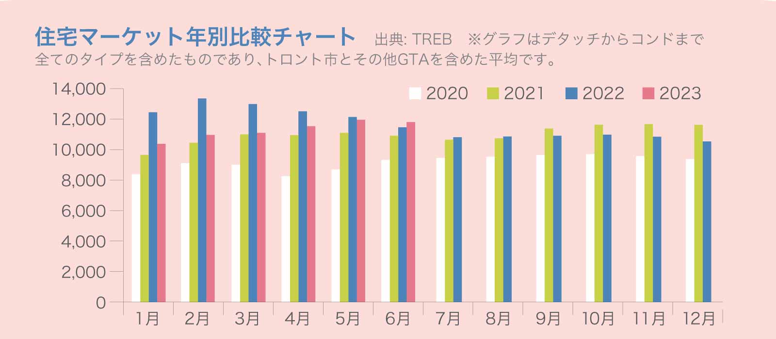 2023年6月のTRREB全域・全物件タイプの総取引数は7,481件となり、昨年同月の6,422件からプラス16.5%と好調です。5月に続きマーケットの動きは活発に見えますが、マクロマーケットによりその動きに違いが大きく、価格帯などの要素により差はあるのは間違いありません。