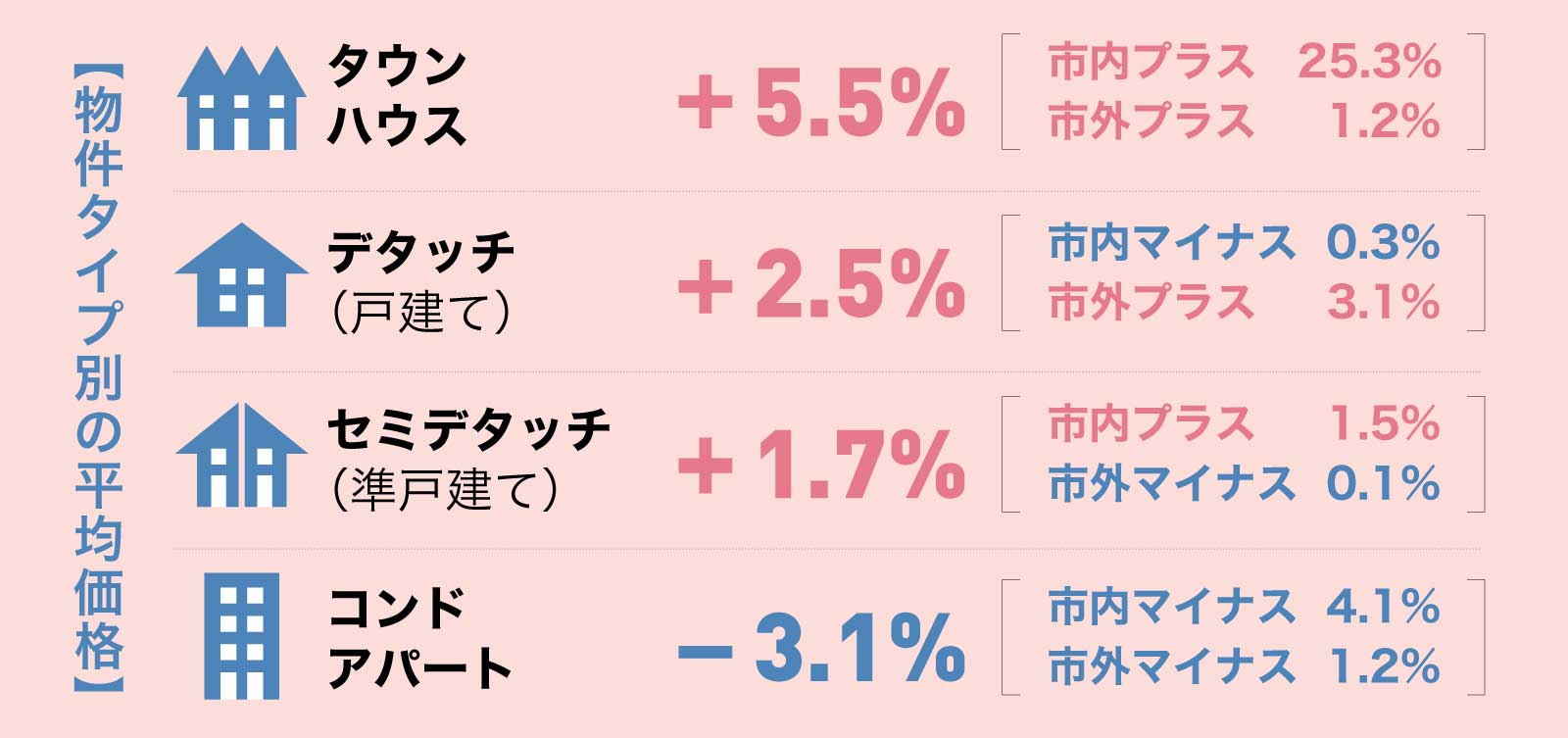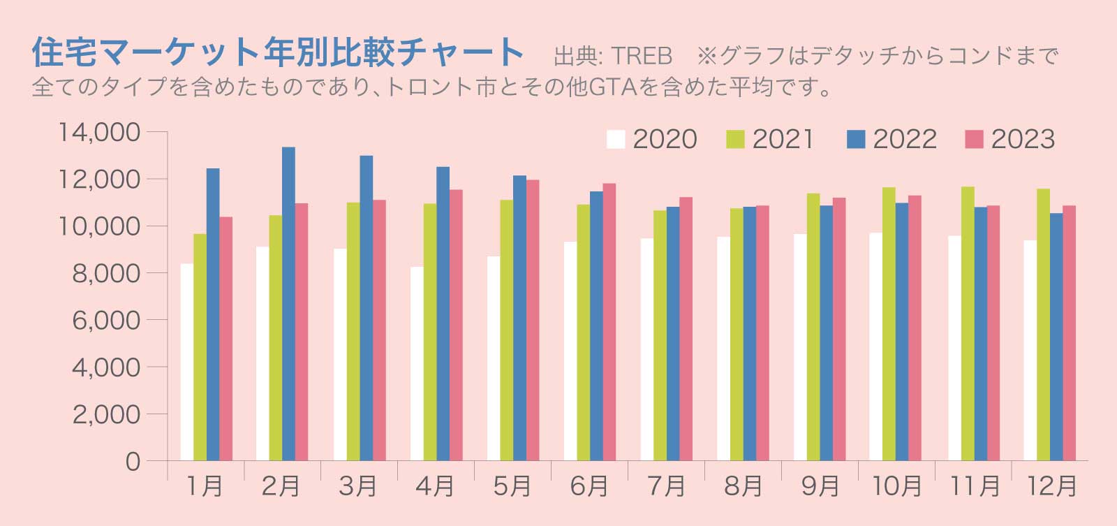 2023年12月のTRREB全域・全物件タイプの総取引数は3,444件で前年12月の3,090件からプラス11.5%となっています。これだけ見ると上昇幅もあり動きが良いように見えますが、取引総数としては2021年のそれから半数近くに落ち込んだままです。