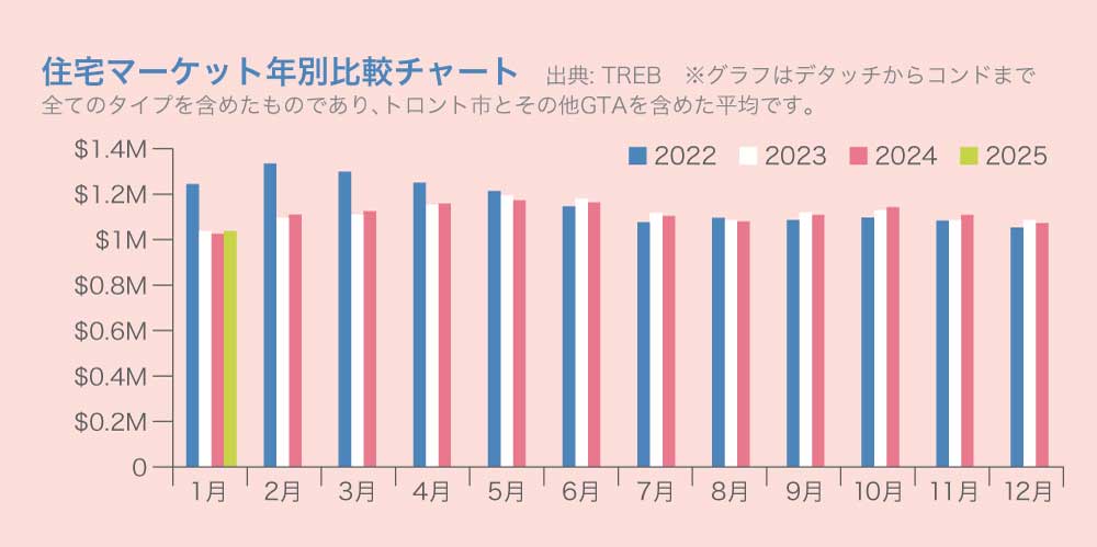 2025年1月のTREEB全域・全物件タイプの総取引は3,847件となり、2024年1月の4,177件から-7.9%の減少となりました。冬になりマーケットが落ちるのは例年のことではありますが、それだけではなく現在のカナダの経済状態や米国との貿易摩擦の懸念がマーケットにマイナス影響として表れていると思われます。
