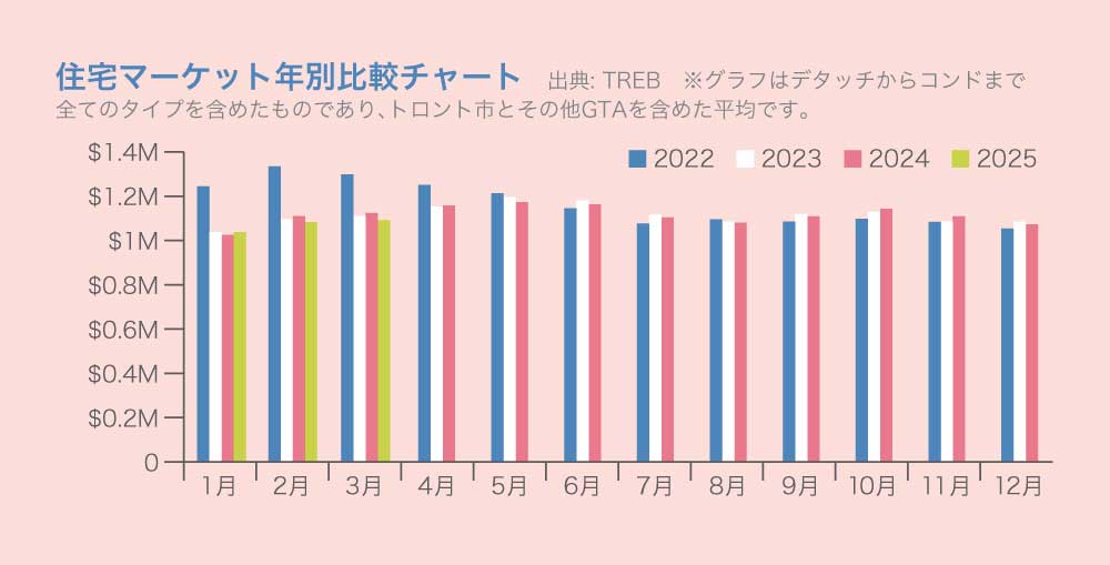 2025年3月のTREEB全域・全物件タイプの総取引数は5,011件で、2024同月の6,519件からマイナス23.1%と2割以上の減少を見せました。春のマーケットになり活性化も期待されていますが、スタートはゆっくりとしています。