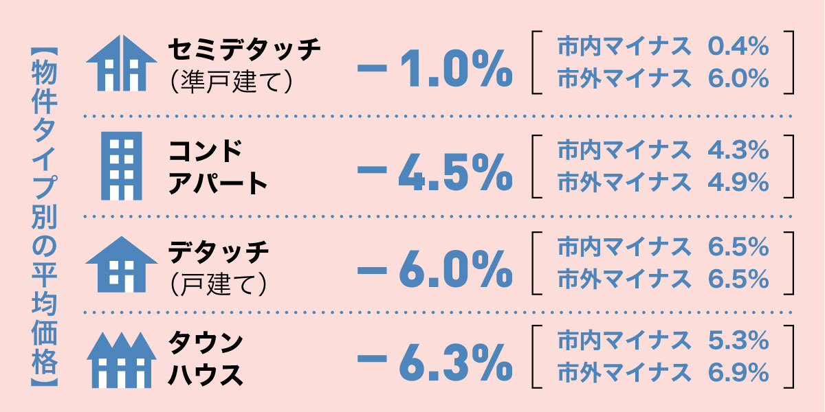気になるのは高止まりする在庫レベルです。デタッチ(戸建て)は2023年6月の6,519件から1万4000件強と2年間で倍以上に増え、コンドアパートも同じような状況です。現時点で過去10年平均の在庫レベルを大きく上回り、この長く続く在庫数の積み上げはマーケット価格への下方圧力となっていると見られています。