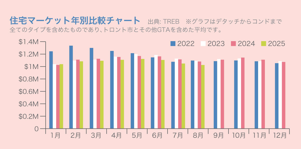 2025年8月のTREEB全域・全物件タイプの総取引数は5,211件となり、2024年8月の5,029件からプラス2.3%の増加となりました。全物件タイプの平均価格は102万2,143ドルで、2024年同月の107万7,742ドルからマイナス5.2%の減少。2022年2月のピーク以降、2022年3月に始まったカナダ政府のレート切り上げに端を発する価格落ち込みは現在も回復を見せていません。