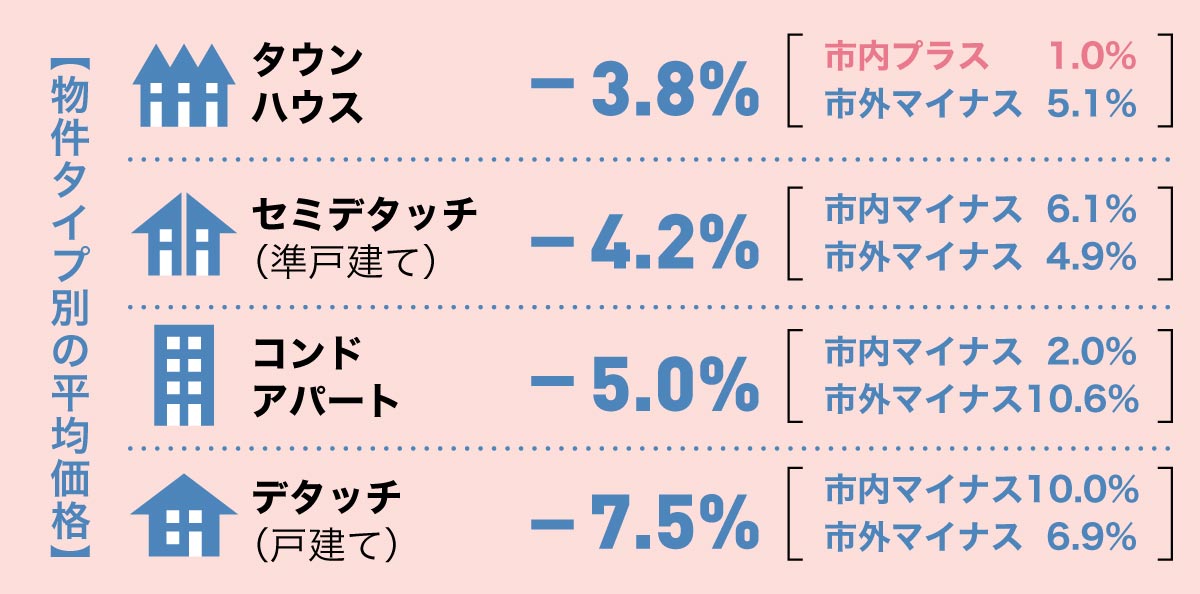 通常人気の高い市内戸建ての価格が下がっていますが、実は市内戸建てそして準戸建ての取引数は昨年同月比で2桁代の伸びを見せており、低価格を狙い買い手が動き出しているとも見えます。インフレ率は政府のターゲット以内に抑えられており、レート切り下げによる市場への刺激も期待したいところですね。