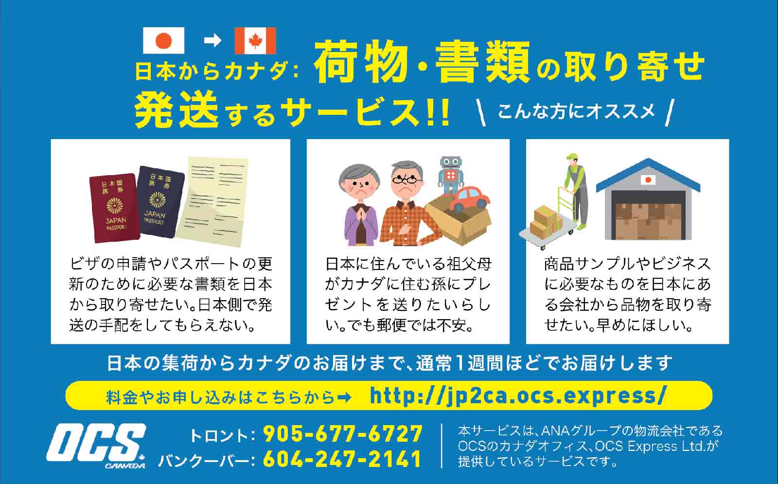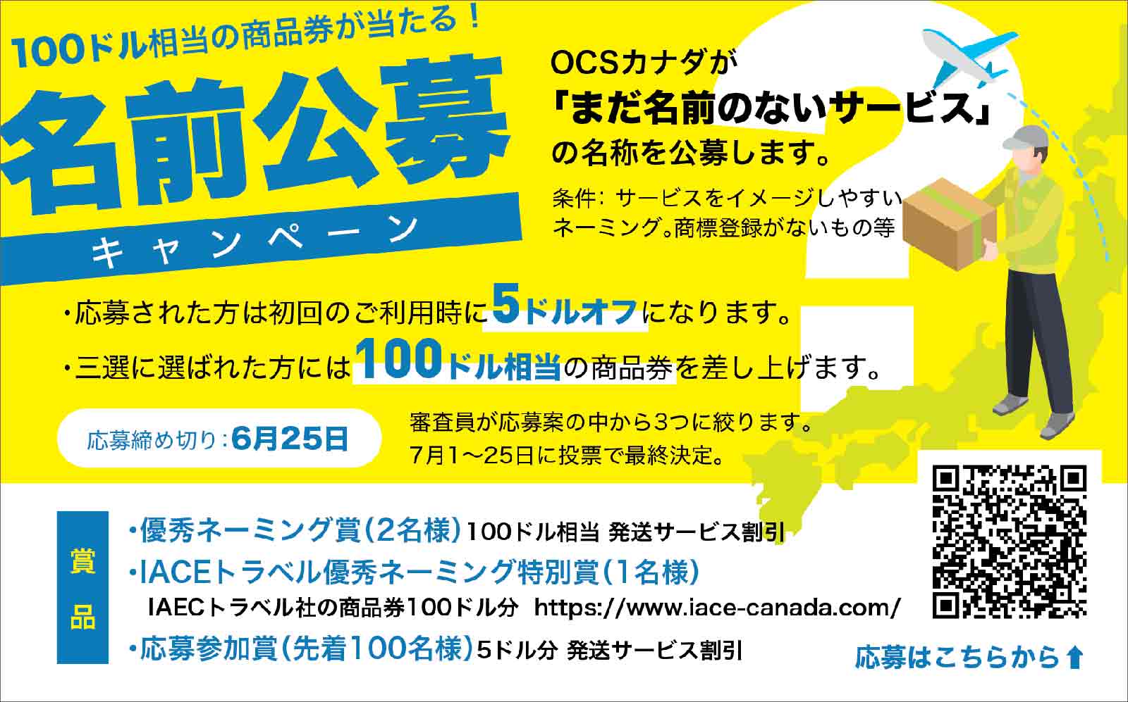 2021年6月2日100ドル相当の商品券が当たる!「まだ名前のないサービス」名称公募キャンペーン|トロントのトレンドを追え!WHAT’S HOT OCSカナダが日本からカナダへの荷物・書類の取り寄せ・ 発送するサービスを開始するにあたり、新サービスの名前を公募する。【条件】 サービスをイメージしやすいネーミング。商標登録がないもの等。応募された方は初回のご利用時に5ドルオフになります。三選に選ばれた方には100ドル相当の商品券を差し上げます。応募締め切り: 6月25日 7月1〜25日に投票で最終決定。優秀ネーミング賞(2名様) 100ドル相当 発送サービス割引IACEトラベル優秀ネーミング特別賞(1名様) IAECトラベル社の商品券100ドル分応募参加賞(先着100名様) 5ドル分発送サービス割引