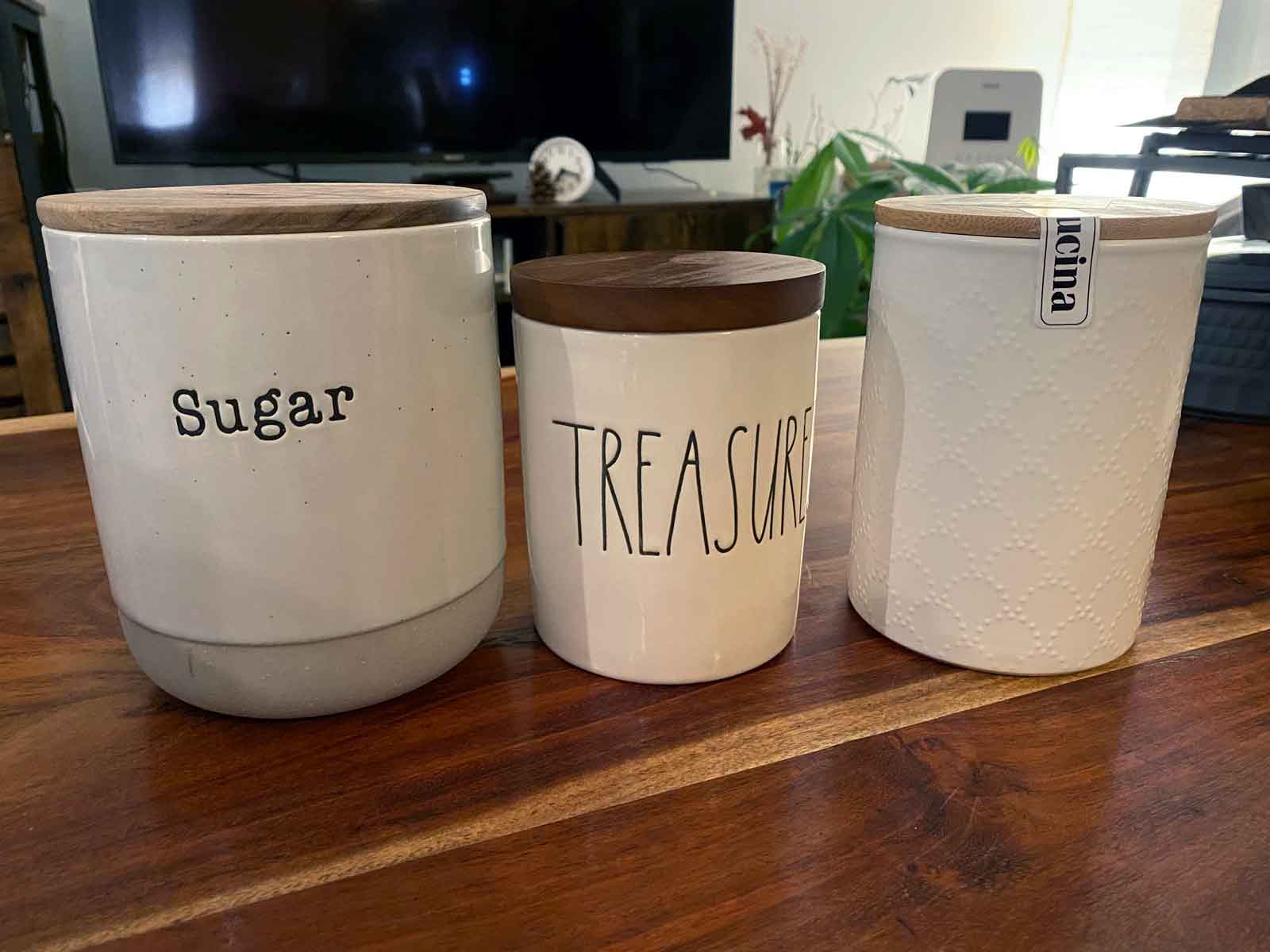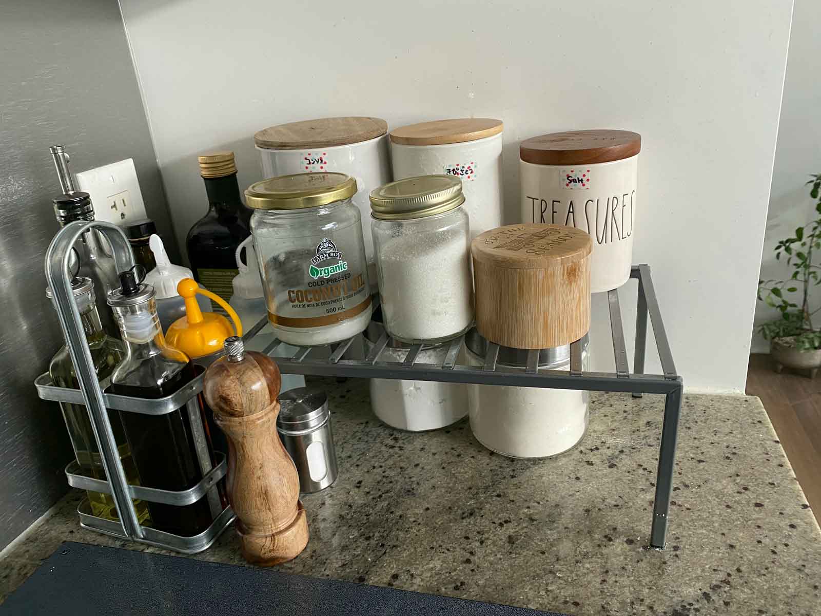 ふたはひねったりせず、片手ですぐに開けられます。コンソメ・砂糖・塩など使用頻度の高いものをすぐ手が届くところに並べておくことで、キッチンをあっち行ったりこっち行ったりせず、その場でアクション完了。この“蓋”がポイントなのですが、全部winnersで購入しました。それぞれ6〜9ドルくらいでした。